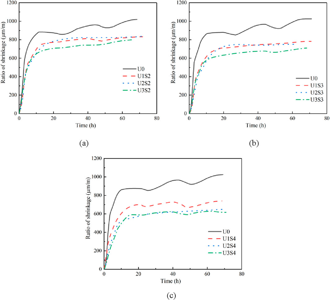 The experimental results demonstrate that only low-fineness SSP at the 20% dosage (specimens U1S2 and U2S2) exhibited a shrinkage-suppressing effect, reducing the 60-day shrinkage by 1.80% and 1.05%, respectively, compared to the control group. All other dosage groups, particularly high-fineness U3S3, exacerbated shrinkage. Notably, specimen U3S4 (40% dosage) showed a substantial increase of 21.53% in shrinkage relative to the control.