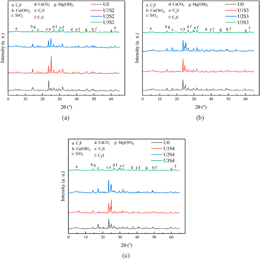 Dosage effect analysis demonstrates that increasing SSP dosage systematically attenuated the characteristic peak intensities of Ca(OH)2, Mg(OH)2, and AFt. For instance, the Ca(OH)2 peak intensity in the S2 group decreased by approximately 35% when the dosage increased from 20% to 40%. This reduction corresponds to a decrease in cementitious phasesand an increase in porosity. This finding not only explains the progressive decline in compressive strength with higher SSP dosage observed in Figure 5 (strength reduction ≥15% at 40% dosage), but also corroborates the micro-mechanism underlying the lowest drying shrinkage consistently observed for the 20% dosage groups in Figure 6 namely, sufficient hydration products effectively densifying the matrix.