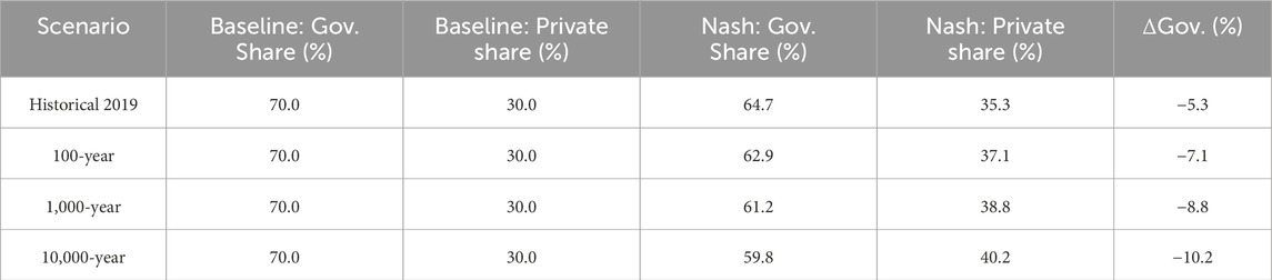 Table 2 summarizes the comparative allocations between a baseline contract (70% government – 30% private) and the NB solution. The results indicate that, across all flood scenarios, the Nash equilibrium consistently reallocates a greater share of losses to the private sector. The magnitude of adjustment ranges from −5.3% in the 2019 flood to −10.2% in the 10,000-year scenario, reflecting the tendency of bargaining outcomes to reduce the government’s fiscal exposure under high-magnitude risks.
