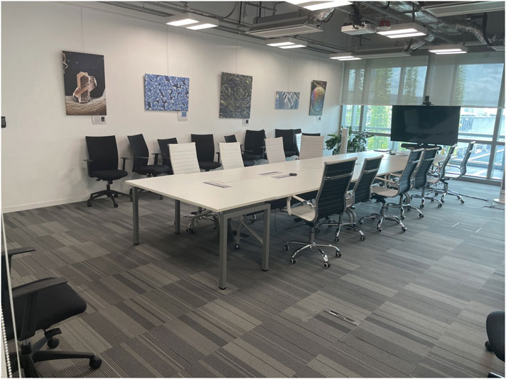 The thermal hybrid model was developed in an indoor space inside the CREATE building (Singapore). The dimensions of the room are 6.54 x 10.00 x 4.65 m. Figure 1 provides a visual description of the room. Two opposite sides of the room were made of double-layer glass window covering an area of 20.9 m2. The glass wall facing outdoor had a metal structure to support the glass elements that was neglected for the study. The other 2 opposite walls were standard walls composed of concrete. Similarly, the ceiling was made of concrete and painted in black. The A/C inlets were hanging from the ceiling at 3.2 m above the floor. The space between the A/C inlets and the ceiling was full of tubes and other systems/elements. In the model this volume was considered as porous media due to the difficulty to consider it in detail and the minor influence in the thermodynamics characteristics of in the rest of the room. In the lower part of the room where users are located, the pattern of the air flow is mainly driven/forced by the flow (directed downwards) at the A/C inlets (see Section 3.4). Only the light fixtures at the same height as the A/C inlets were considered as solids elements (Figures 1, 2).