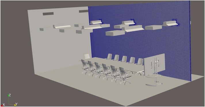 The model representing the meeting room was designed to closely match the real-world dimensions and layout of the space, with a focus on preserving the geometrical accuracy of the elements that significantly influence airflow and thermal distribution.