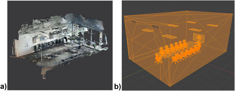 The room geometry was created using Blender, guided by reference data from an iOS LiDAR scanning application (3D Scanner App). The scan (Figure 3) served solely as a visual and dimensional reference, while all critical architectural features, such as vent openings, inlet positions, and lighting points, were validated and adjusted using manual on-site measurements. A clean and accurately dimensioned geometry was then remodelled from scratch in Blender to ensure suitability for CFD simulation purposes.