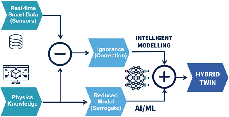 Figure 6. Schematic diagram for the hybrid mode consisting of a Surrogate model and ignorance/correction model based on the difference between the physics simulations and the real on-site measurements.