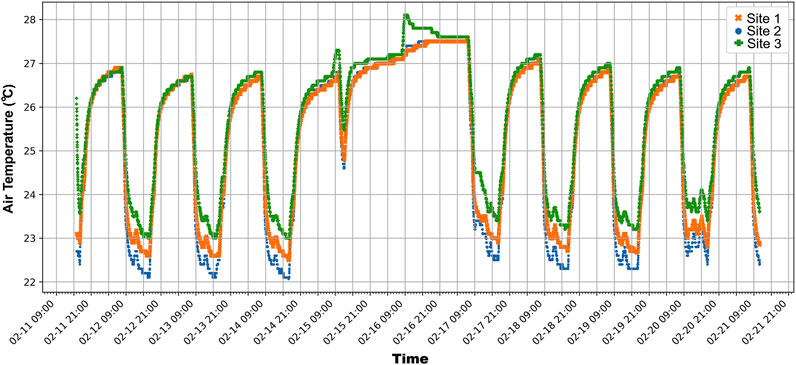 Figure 7 shows the temporal evolution of the air temperature in the room throughout the campaign. Records show a clear pattern driven by the A/C system, following its operating hours. During daytime, air temperature in the room is ∼23.2 °C with an amplitude of ∼1 °C between the hottest and coldest sites inside the room. During the evening, when A/C is switched off, air temperature in the room tends to be homogenized (negligible spatial differences) increasing up to ∼27 °C just before the A/C system starts the following morning. This diurnal cycle is quite constant throughout the measurement period except during the weekend when the A/C system is not working.