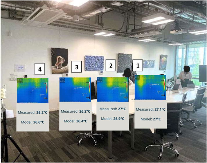 Table 8 presents a comparison between measured values and simulated outputs at key locations within the room. These include air temperature, and surface temperature measurements taken both inside and outside the simulated domain. Notably, surface temperatures were obtained using a thermal infrared (IR) camera, and air-related quantities were recorded using calibrated sensors.