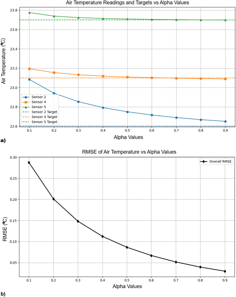 Results presented in the Table 7 use a regulation weight α of 0.5, balancing the fit between sensor data and the preservation of the expected physical features of the flow field from the surrogate model (Section 2.5). To highlight the hybrid model’s sensitivity to this parameter, Figure 9a illustrates the evolution of the predicted temperature values at the three sensor locations as a function of α, while Figure 9b presents RMSE (including all sensors) as a function of α, showing that α = 0.5 can be considered the point on the curve where the improvement starts to level off. Beyond this point, increasing α further gives less gains while the physical structure/features of the flow could be affected. While the best results are obtained for α = 0.9 (RMSE = 0.030 °C), α = 0.5 achieves an acceptable RMSE = 0.087 °C.