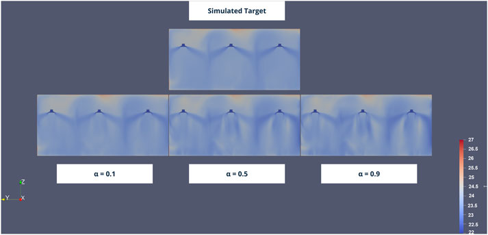 Figure 10. Representation of the simulated air temperature (°C) target and effect of α on the reconstructed field. Higher values of α will match better the measurements of the sensors (Figure 9) but the spatial distribution of air temperature will diverge from the target simulation. The opposite will occur with low values of α.