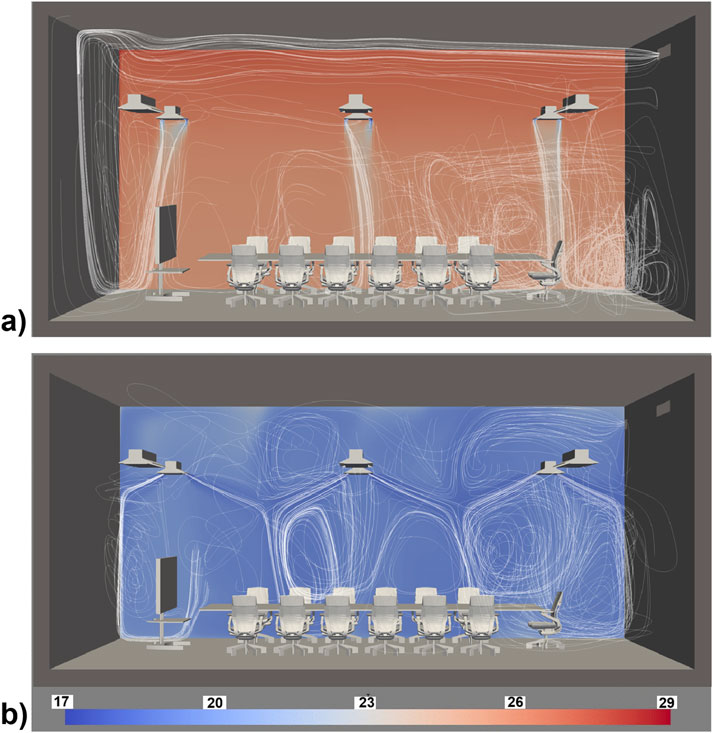 Figure 11. Visualisation of the spatial distribution of air temperature (°C) and air movement (streamlines) provided by hybrid model when the A/C work in different conditions (a) lowest speed (0.1 m/s) and temperature (17.8 °C), and (b) highest speed (2.1 m/s) and lowest temperature (17.8 °C).