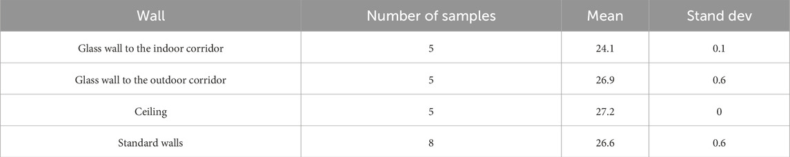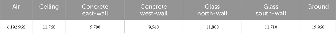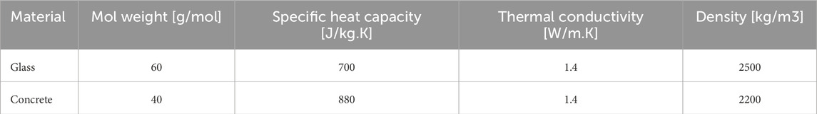 The solid regions were grouped into two primary material types, concrete and glass, each with distinct thermal properties such as thermal conductivity, specific heat capacity, and density. These material parameters are summarized in Table 2 (Cavanaugh and Speck, 2002; Crystran, 2020). To simplify, all solid envelopes were approximated to a thickness of 15 cm, including the glass walls. Thus, a single equivalent homogeneous layer was used with properties that reproduced the measured interior surface temperatures.
