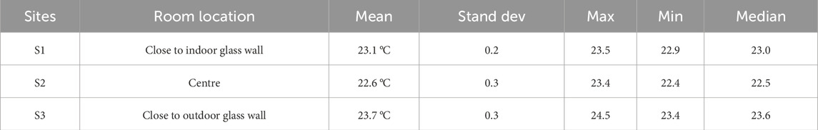 Table 6 presents some statistical results of the air temperature records between 10:30 and 11:00 am (excluding the weekend period). Results show that the site close to the glass wall facing the outdoor corridor (S3) was the warmest with a difference of 0.6 °C with respect to the opposite glass wall facing the indoor corridor (S1). The lowest air temperature was in the centre of the room (S2), 1.1 °C lower than S3. During this period of the day, air temperature registered at each sensor was quite stable. The highest amplitude of values (1.1 °C) was in the site close to the outdoor corridor (S3) due to the influence of the conditions outside the building.