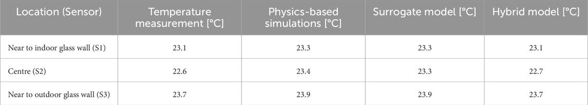 The performance of the derived surrogate model is assessed by comparison with the observed temperature data (Table 8). Overall, the surrogate model demonstrates strong agreement with measured values, confirming its capacity to capture the dominant thermal behaviour of the room. However, a notable discrepancy was observed in the central area of the room, where the model fails to capture the local temperature drop. This discrepancy is aligned with the fact that the physics-based model (training data) cannot represent this localized phenomenon and thus neither can the reduced-order model.