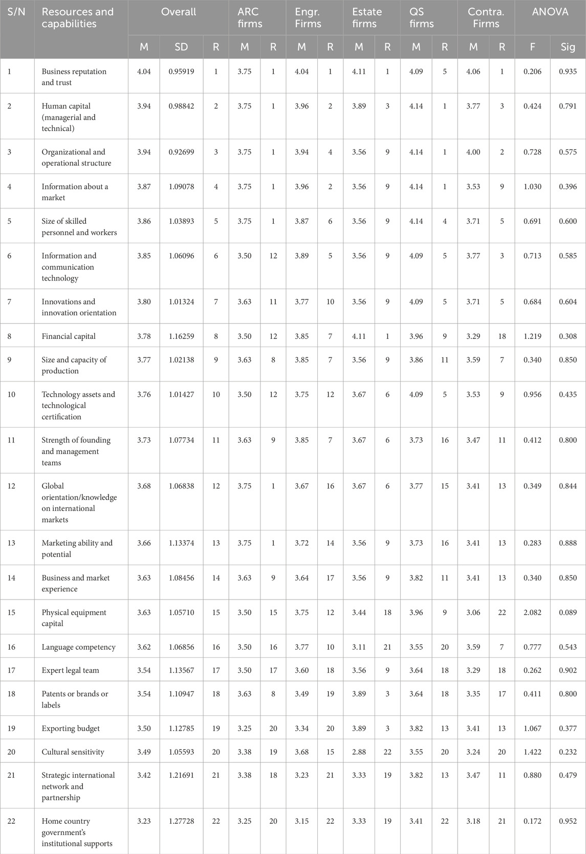 In the opinions of the quantity surveying firms, human capital (managerial and technical), organizational and operational structure, and information about a market were the top ranked resources and capabilities with each having a mean score of 4.14. These were followed by size of skilled personnel and workers (M = 4.14) including business reputation and trust, information and communication technology, innovations and innovation orientation and technology assets and technological certification each with a mean score of 4.09. The least ranked include home country government’s institutional supports, language competency, cultural sensitivity, expert legal team and patents or brands or labels. In the views of construction companies or contractors, business reputation and trust were the top ranked resource and capability with a mean score of 4.06. This was followed by organizational and operational structure (M = 4.00), human capital (managerial and technical) (M = 3.77) including size of skilled personnel and workers and information and communication technology each with a mean score of 3.77. The resources and capabilities ranked low include physical equipment capital, home country government’s supports, cultural sensitivity, financial capital and expert legal team.