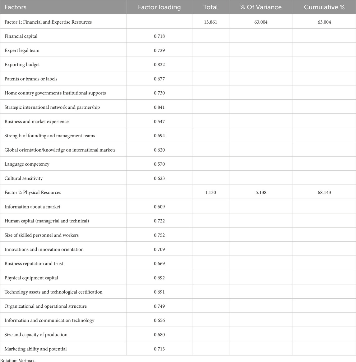 The total variance explained by each of the components extracted shows that the first component (factor1) accounted for 63.004% of the observed variance while the second component (factor 2) accounted 68.143% of the observed variance. This shows that 63.004% of the observed variance were shared by eleven (11) variables (resources and capabilities) while the second eleven (11) variables also shared 63.004% of the observed variables. The results of the factor loading values of each of the variables (resources and capabilities) revealed that the values range between 0.547 and 0.841. In Factor 1 (Financial and Expertise Resources), the results show the resources and capabilities and their loading values including financial capital (0.718), expert legal team (0.729), exporting budget (0.822), patents or brands or labels (0.677), and home country government’s institutional supports (0.730). Other resources and capabilities are strategic international network and partnership (0.841), business and market experience (0.547), strength of founding and management teams (0.694), global orientation/knowledge on international markets (0.620), language competency (0.570), cultural sensitivity (0.623).