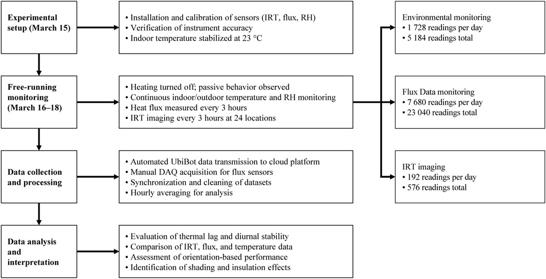 The research methodology (Figure 1) integrates experimental setup, controlled preconditioning, multi-sensor field monitoring, and data synthesis within a structured sequence. The field campaign was conducted on a full-scale cement-stabilized, core-insulated rammed earth residence in southern Ontario to evaluate its short-term thermal and hygrothermal response under representative winter conditions. Following sensor calibration and thermal stabilization, the building was transitioned to a free-running state to isolate envelope-driven dynamics. Infrared thermography, surface heat-flux sensing, and in-situ temperature and humidity monitoring were deployed concurrently to capture thermal lag, diurnal stability, and hygrothermal buffering. Data acquisition combined automated and manual systems, followed by synchronization, averaging, and cross-validation of datasets. This integrative framework ensured a comprehensive and reproducible assessment of the envelope’s passive performance, linking in-situ evidence to material and environmental parameters.