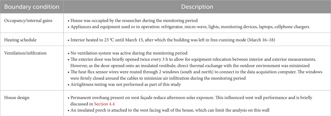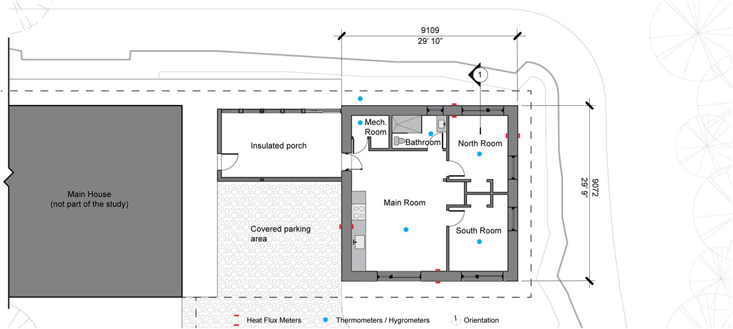 The selected case study is a single-story guest house, physically connected to the main residence by a continuous roof forming a covered entry and parking area. Located in southern Ontario, the building is constructed with cement-stabilized rammed earth walls incorporating a core insulation layer. The load-bearing walls are reinforced with steel rebar placed on both the interior and exterior faces to enhance structural integrity while preserving the monolithic appearance of the wall assembly (Figure 2). A continuous core insulation layer, composed of 152 mm thick foam board, is integrated within the wall profile to improve thermal resistance and minimize heat loss without compromising the wall’s thermal inertia. The full assembly results in a consistent wall thickness of 508 mm, which facilitates comparative analysis of thermal behavior across different orientations. Table 1 summarizes the wall assemblies and material properties, while Table 2 outlines the boundary conditions applied during the monitoring period. The building layout is compact and symmetrical, allowing for orientation-based monitoring of thermal performance. The house features two main bedrooms located on the north and south sides of the plan respectively (Figure 3). These spaces are separated by a central main area, which include the kitchen and open on the bathroom and mechanical room to the north. All interior spaces are exposed to varying degrees of solar radiation depending on their position. The primary façade faces south, with a window-to-wall ratio (WWR) of approximately 19%. The east façade has a WWR of about 7%, the north façade less than 10%, and the west façade has no fenestration. This distribution maximizes passive solar gains on the south side while limiting winter heat losses on other orientations. The building’s footprint and envelope allow for controlled monitoring of thermal gradients across interior and exterior zones and all wall orientations.
