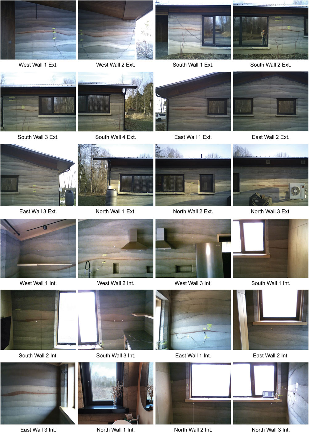 Figure 4. Visual images showing the 24 interior and exterior wall segments scanned at fixed time intervals throughout the diurnal monitoring cycle. Segment name tags correspond to those referenced in Section 3.1 for the analysis of surface temperature trends.