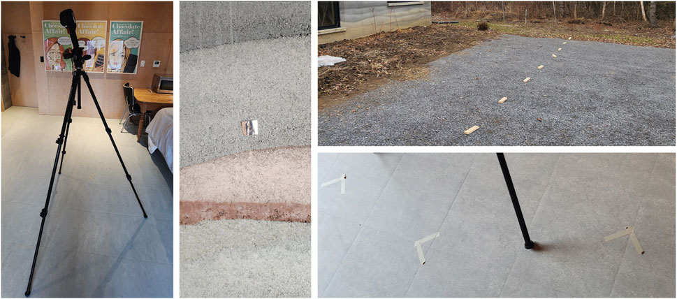 Thermographic data were collected using a HIKMICRO B10S thermal camera (640 × 480 resolution, ±2% accuracy), with a standardized emissivity value of 0.95 and concurrent logging of ambient environmental conditions. To ensure consistent image acquisition, reflective markers were placed on the wall surface and floor markers were used to position the tripod across all sessions. Temperatures at the center of each image, aligned with reflective markers and adjacent to heat flux sensors, were recorded to allow direct comparison with thermal flux data (Figure 5). This protocol enabled high-precision spatial and temporal analysis of the wall’s thermal behavior.