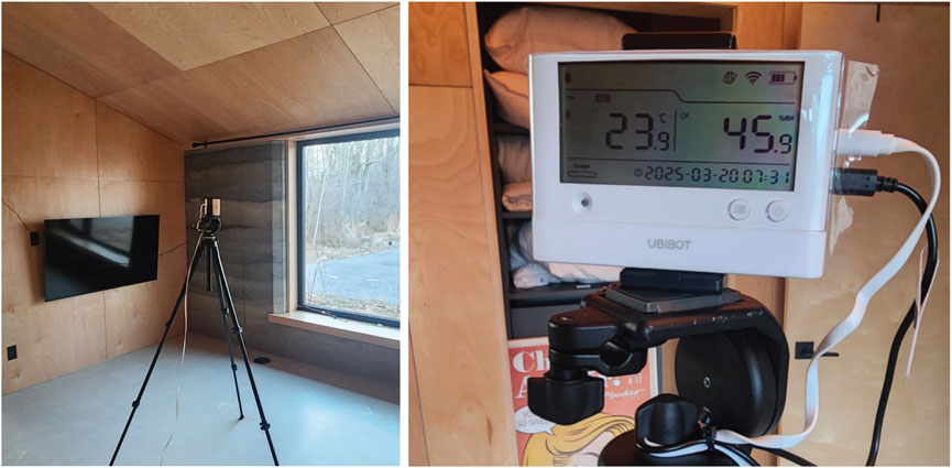 To assess thermal response and hygrothermal behavior, indoor and outdoor temperature and RH were recorded every 10 min during the three-day measurement using UbiBot RS485 TH30S-B probes and UbiBot wireless sensor WS1 Pro data loggers. All sensors were mounted on tripods positioned at the center of their respective rooms to minimize the influence of localized thermal anomalies, such as proximity to walls, windows, or heat sources, and to provide a more accurate representation of overall room conditions (Figure 7).