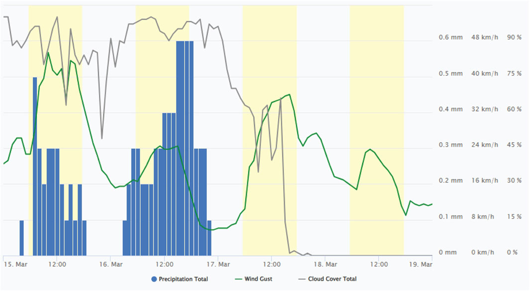 Figure 9. Climatic conditions recorded at hourly intervals from March 15 to March 19, showing wind speed, precipitation, and cloud cover based on data from Point Petre (AUT) ONT weather station (43.8395°N, 77.1515°W, 78.6°m; WIGOS ID 0-20000-0-71430).