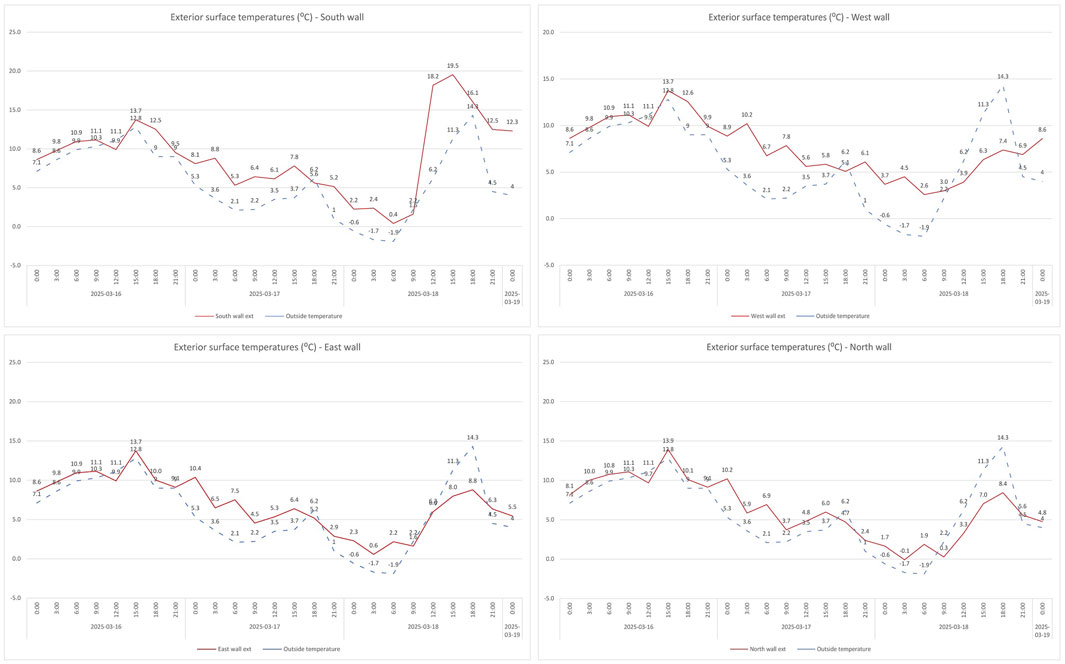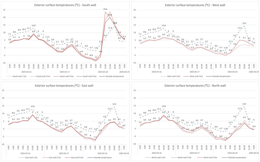 Figure 10. Exterior surface temperature trends for all four wall orientations compared to outdoor air temperature over the three-day monitoring period (March 16–18, 2025). Each graph shows temperature readings from multiple measurement points per façade.