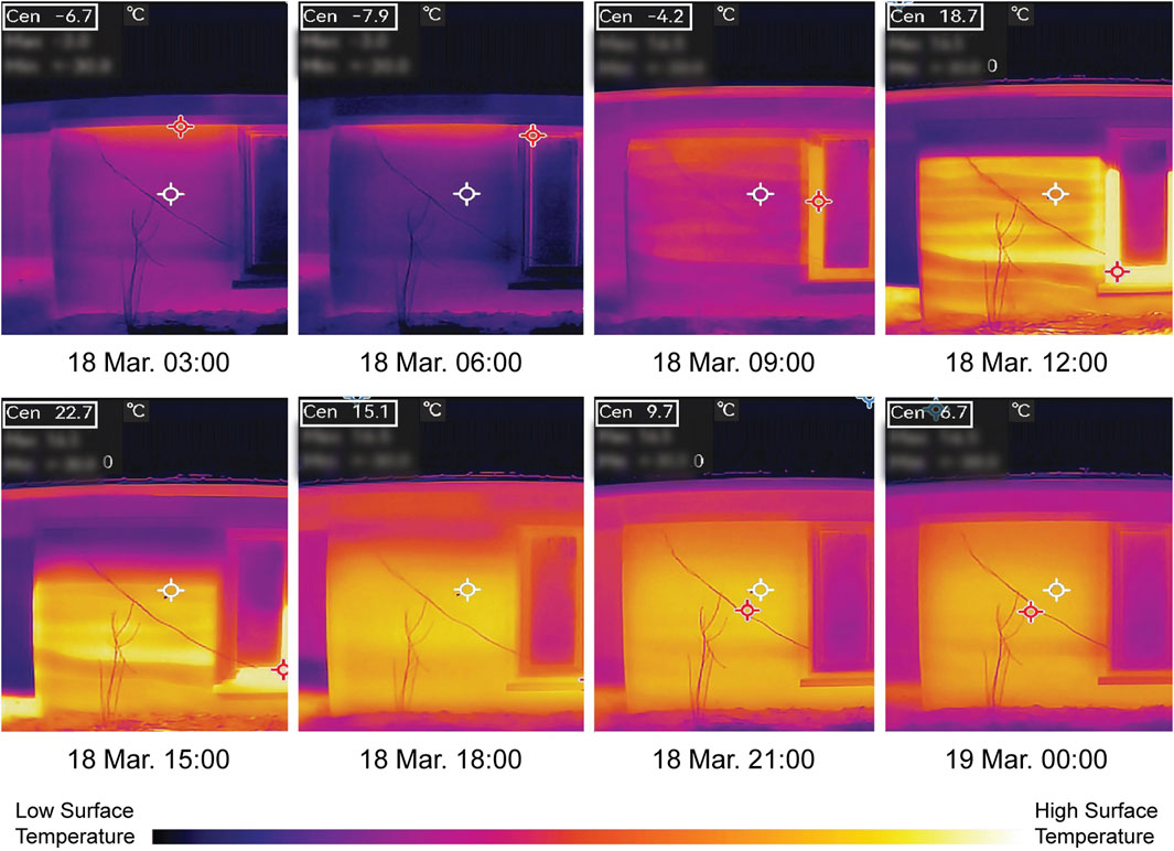 Figure 11. Sequence of IRT images captured on March 18 at 8 key intervals illustrating diurnal thermal behavior of the South wall 1 segment under passive conditions.