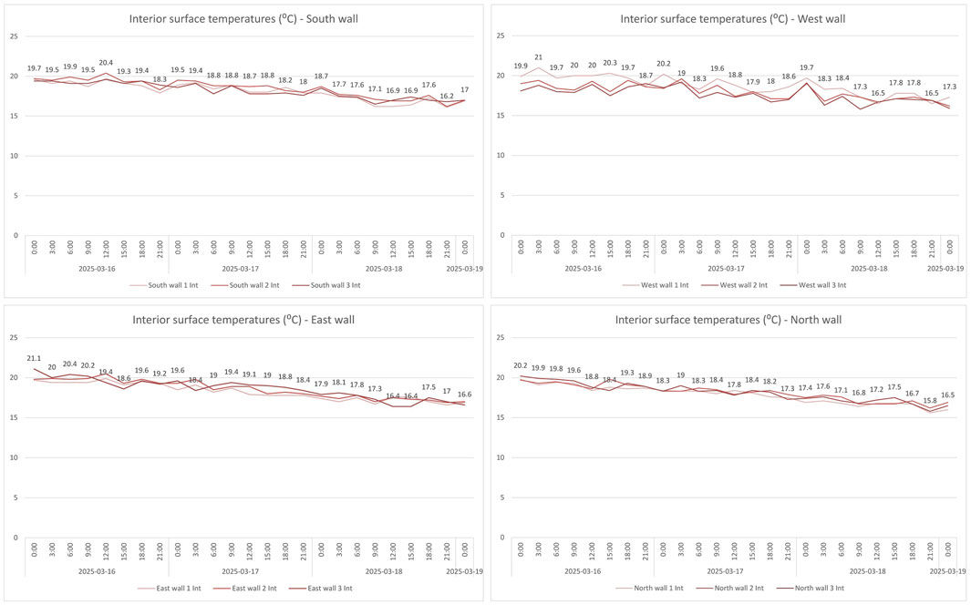 Figure 12. Interior surface temperatures (March 16–18, 2025) from three measurement points per wall, showing minimal diurnal fluctuation.