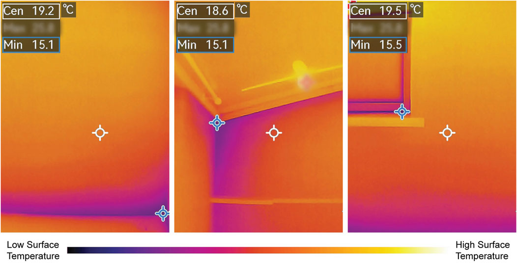 Interior surfaces, by comparison, remained remarkably stable. As shown in the surface temperature graphs (Figure 12), all four wall orientations maintained readings between 16.3 °C and 21.1 °C over the entire monitoring period. Even during peak daytime exterior heating, interior wall temperatures varied by less than 2 °C. The west-facing wall displayed the widest range (from 19.8 °C to 16.3 °C), while north- and south-facing interiors remained close to 17.5 °C–18.5 °C. This indicates that the core insulation layer effectively dampens temperature fluctuations, buffering the occupied space from external thermal dynamics. However, thermal imaging revealed local anomalies at floor junctions and fenestration edges, indicating potential thermal bridging (Figure 13). These bridges were spatially limited and did not significantly alter the overall interior temperature stability, but they highlight localized areas where detailing improvements could further enhance envelope performance.