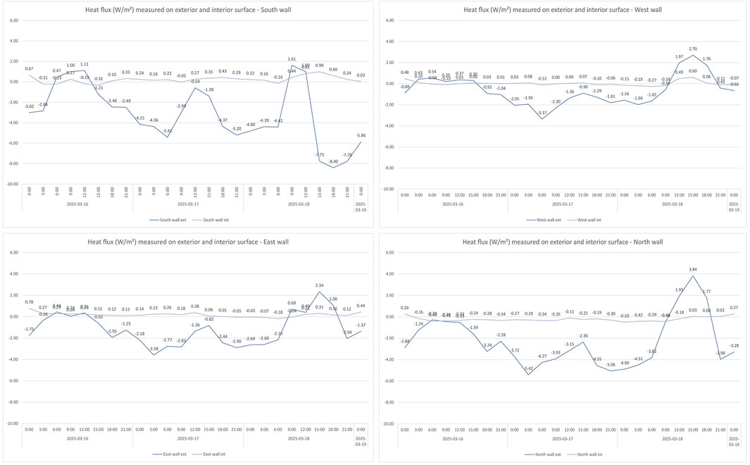 Heat flux measurements recorded on both the exterior and interior surfaces of the rammed earth walls provide insight into the directional energy exchanges occurring across all wall orientations during the unheated monitoring period. Values were logged at 3-h intervals between March 16 and 18, capturing variations driven by solar radiation, ambient temperature, and wall mass response.