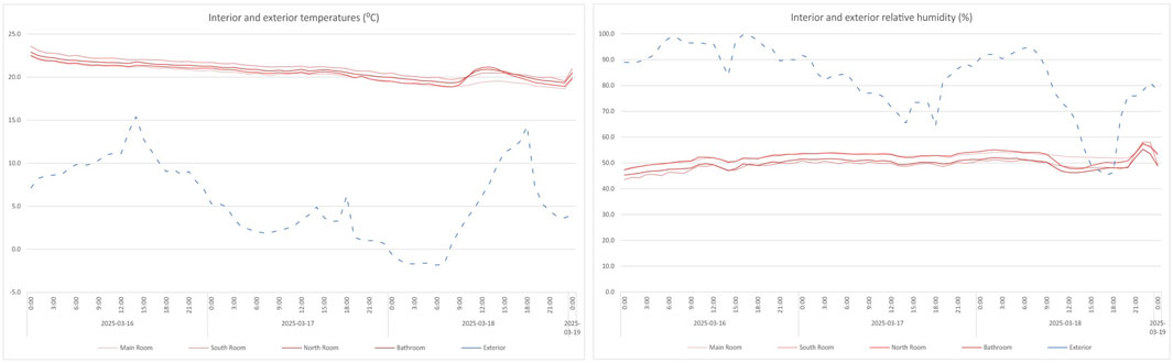 Although raw data were collected at 10-min intervals, hourly averages were calculated to filter out transient fluctuations and capture longer-term thermal and moisture trends relevant to passive performance evaluation. Indoor temperature readings were used to assess the influence of thermal inertia and passive heat retention during unheated periods, while outdoor measurements provided the baseline for identifying thermal gradients across the envelope. Concurrent RH tracking offered insight into indoor moisture stability and potential condensation risks, especially under conditions of high exterior variability. Although no sensors were embedded within the wall structure, the contrast between indoor and outdoor data yielded meaningful information on the envelope’s buffering capacity.