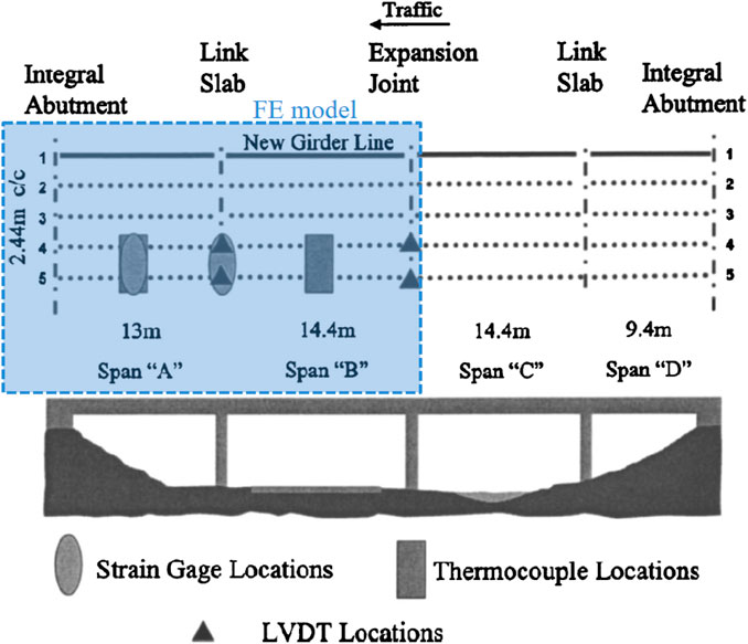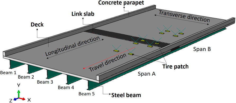 A three-dimensional finite element (FE) model of the Plott Creek Bridge in Haywood country is developed in ABAQUS Standard (ABAQUS, 2020) to study the effect of traffic loads and temperature gradients on the behavior of link slabs. The FE model represents the two spans (A and B) instrumented by Wing and Kowalsky (2005) resulting in a 27.4 m (1,079 in.) long steel girder bridge, as shown in Figures 2, 3. Each bridge component (i.e., deck slab, supporting girder, link slab, and concrete parapet) is modeled using eight-node trilinear displacement and temperature elements (C3D8T). The reinforcing bars are modeled using two-node 3D thermally coupled truss elements (T3D2T) and embedded into concrete elements, assuming a perfect bond. All parts, except the girder ends at the joint location (debonded zone) are fully bonded. Tie constraints are created to simulate the full composite action between the concrete deck slab and girders and the bond strength between the deck and link slab interface. As the studied link slabs did not include bond failure, using tie constraints to model the cold joint formed when casting two concretes at different times is a reasonable approach. A tie constraint is also employed to simulate the interface between the parapet and deck slab, considering that both parts are perfectly joined together through steel reinforcing bars. Supports at beam ends are imposed to replicate the actual bridge conditions. These supports are defined as lines of nodes at the bottom of each girder, modeled by constraining the appropriate degrees of freedom. The left support at the location of the abutment is fixed. The supports at the interior pier, beneath the link slab, are assumed to be pinned. The expansion joint is simulated by a line of roller supports.
