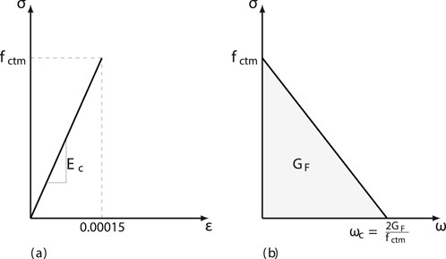 Figure 4. Uniaxial tensile behavior of concrete: (a) stress-strain response; (b) stress-crack opening displacement relationship.