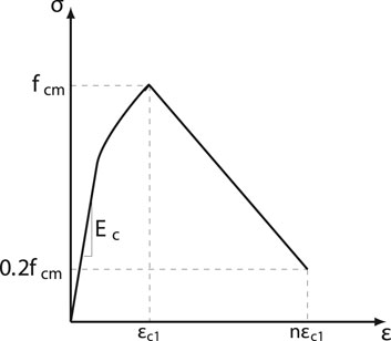 The compressive behavior of concrete is defined by the uniaxial stress-strain relationship shown in Figure 5 for unconfined concrete, divided into three parts: 1) An initial uncracked region up to a stress of
