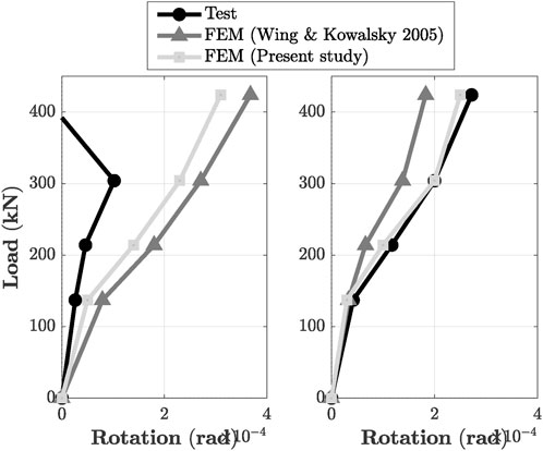 The analysis described in the previous two sections provided the data to validate the model using test results from Wing and Kowalsky (2005) when subjected to traffic load. The validation process assumes that this loading acts alone and accounts for the prior effect of dead load. The FE model is validated for vehicle loading by placing the truck in the same position as in the live load test to produce the maximum negative moment in the link slab (refer to Figure 3). The results of the present study align with those reported by Wing and Kowalsky (2005). Figure 6 compares the FE and the test rotations at the link slab on Span B along girder lines 4 and 5, respectively. The rotations from the FE model are obtained by dividing the difference in nodal displacement by the vertical distance between the two nodes. The computed rotations at the bridge site are based on the readings from the LVDTs by dividing the displacement difference at each location by the vertical distance between the sensors. Figure 6 includes the results of the FE model developed by Wing and Kowalsky (2005) to verify the field test program for comparison purposes. It is important to emphasize the marked improvement achieved with the numerical model developed in this study compared to the previous grillage-based model by Wing and Kowalsky (2005). This improvement can be attributed to a more accurate geometric representation and the consideration of the CDP material model in this study, which captures the nonlinear behavior of concrete more realistically. Specifically, for girder 4, discrepancies in sensor readings at this location led to some variation between the test data and the results of the FE model. While the proposed numerical model accurately aligns with the test data in the initial part of the curve, challenges were encountered in validating the model beyond the first point due to sensor-related issues that impacted the experimental data. The scarcity of test data and reported issues with the thermocouples during the monitoring period presented challenges in validating the FE model under temperature gradients. This limitation highlights the need for additional field testing and high-quality monitoring data to enable more robust validation under thermal loading.