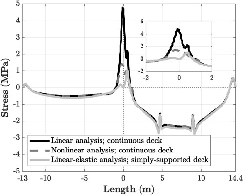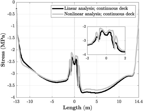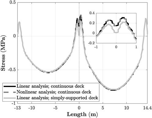 Figure 10. Longitudinal normal stress at the top of the deck due to dead load plus a negative temperature gradient.