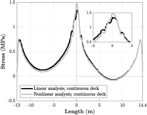 Figure 7 depicts the longitudinal normal stress distribution on the top surface of the bridge deck slab when subjected to sustained loads (i.e., self-weight of the steel girders, deck slab, link slab, and concrete parapet). The construction sequence analysis described in 2.2.3 is performed. Both linear elastic and nonlinear analysis results are presented for the jointless bridge deck with a link slab. As can be observed, the tensile stresses developed in the concrete are approximately 0.31 MPa (45 psi) and 0.80 MPa (116 psi) in the negative and positive sections, respectively. These stresses are below the concrete modulus of rupture, indicating that the bridge structure responds elastically under dead loads. No signs of cracking are noticed at the deck slab due to self-weight. Furthermore, the analysis reveals that the maximum deflection at the center of each simple span (Spans A and B) is approximately 0.0025 m (0.1 in.) and 0.0051 m (0.2 in.), respectively. The calculated girder rotations for Span A and B are approximately 0.00048 rad and 0.00082 rad, respectively. This observed behavior supports the notion that the span bridge behaves close to being simply supported, corroborating the findings of Caner and Zia (1998) regarding the limited contribution of the link slab to the overall flexural stiffness of the bridge structure.