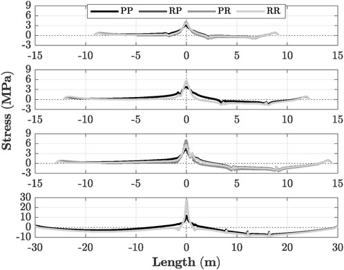 Figure 11 illustrates the stress variations along the bridge length under different support conditions, considering various girder span lengths and a 5% slab debonding. The results indicate that girder support conditions impact the stress distribution within the link slab. Across all support scenarios, the link slab exhibits downward deflection, resulting in tensile stresses at the top surface and compression stresses at the bottom fibers. The stress distribution shown in Figure 11 demonstrates that support arrangements incorporating Roller supports (RR) beneath the link slabs result in higher longitudinal normal stresses on the link slab compared to those with only Pinned supports (PP). These support conditions represent upper and lower stress bounds, emphasizing the influence of Roller supports on the load transfer mechanism and the consequent increase in stress levels in the link slab. Further analysis reveals that interchanging the position of the Pinned support does not have any significant effect on the response of the link slab. In other words, the stress distribution for support cases RP and PR is nearly identical, suggesting that the specific location of the Pinned support has minimal influence on the behavior of the link slab. For all the boundary conditions considered, the developed stresses in the link slab exceed the concrete tensile strength of 2.2 MPa (321 psi). Additionally, Figure 11 shows the relationship between the span length and the stresses developed at the top fiber of the link slab. As anticipated, the findings suggest a significant increase, approximately fourfold and sevenfold, in longitudinal normal stresses at the top fiber of the link slab when extending the span length from 9 m (30 ft) to 30 m (100 ft) under the PP and RR support conditions, respectively. Moreover, elongating the span length from 15 m (50 ft) to 30 m (100 ft) results in a significant fourfold increase in longitudinal normal stresses at the top fiber of the link slab. An increase of nearly 50% in tensile stresses when RR supports are employed beneath link slabs compared to PP supports. Using PP supports, the tensile stresses can be managed if the span length does not exceed 15 m (50 ft).