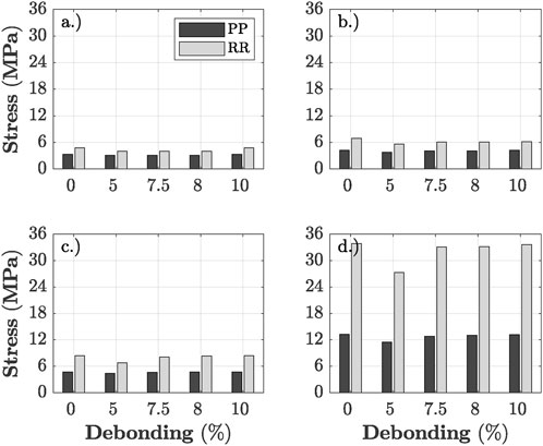 Figure 12. Effect of debonding for various bridge span lengths: (a) 9 m; (b) 12 m; (c) 14.4 m; (d) 30 m.