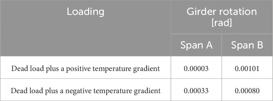 On the other hand, a negative temperature gradient causes tensile stresses on the top surface of the link slab, as illustrated in Figure 10. The maximum tensile stress that resulted after imposing the dead load and a negative temperature gradient is near 1.4 MPa (200 psi), which is less than the concrete tensile stress. The estimated girder rotations from ABAQUS, when the bridge is subjected to dead load plus vertical temperature gradients, are presented in Table 4. The rotations are determined between girder ends over interior supports.