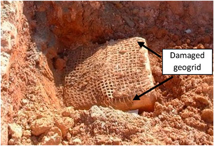 Figure 1. Geogrid reinforcement damage caused by direct contact with the pile cap (Palmeira et al., 2022).