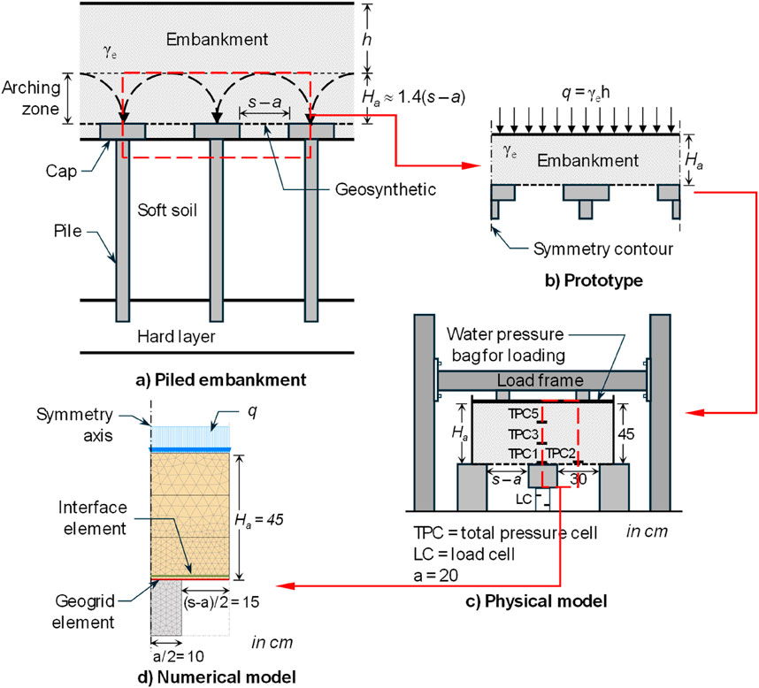 Geosynthetic reinforced embankments on concrete piles have been utilized worldwide as an effective stabilization technique. Essentially, the reinforcement increases the stability of the embankment, while its stiffness enhances soil arching and favors the transfer of the majority of the embankment load to the piles. The piles then transfer the received load to a stiffer soil, thereby avoiding excessive differential settlements and potential embankment failure. To optimize pile foundation design, a cap is installed at the top of each pile, and the efficacy of stress transfer depends on the distance between pile caps (d) and the height of the embankment (H), among other factors.