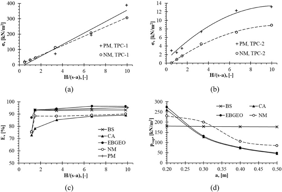 Figure 3. Obtained results: (a) σ recorded at TPC-1 versus H/(s-a), (b) σ recorded at TPC-2 versus H/(s-a), (c) Efficacy (E) versus H/(s-a) and (d) pcap versus a.