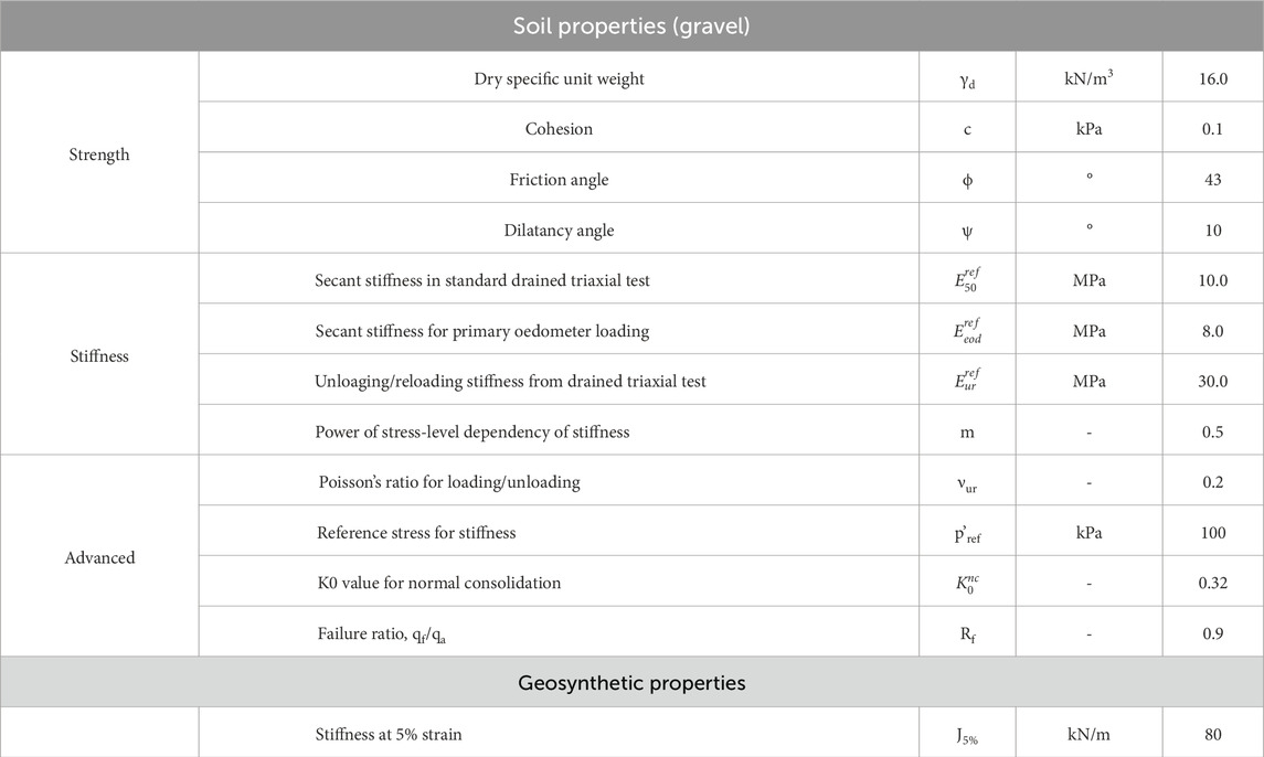 To better understand the stress distribution, numerical analyses were also performed alongside the laboratory tests, utilizing the geometry depicted in Figure 2D under axisymmetric conditions. These analyses were conducted using PLAXIS 2D Finite Element software (Brinkgreve and Vermeer, 2012). The medium was discretized using a mesh composed of 815 triangular elements, formed by 15 nodes and 12 stress points (Gauss integration points), each. In the soil-geogrid-pile contact, interface elements were incorporated, consisting of 5 pairs of nodes and 5 stress points. The soil behavior was modeled using the hardening soil model (Schanz et al., 1999), while the geosynthetic was represented by a geogrid-type element, consisting of 5 nodes and 5 stress points. This type of element only allows for the development of tension forces. Although the pile caps had a square cross-section, they were modeled as circular shapes using the equivalent area concept, as suggested by Han and Gabr (2002). The gravel properties were obtained from large direct shear tests, and the properly scaled tensile strength and stiffness of the geosynthetics were obtained through wide strip tensile tests (ASTM D6637, 2015), as summarized in Table 1.