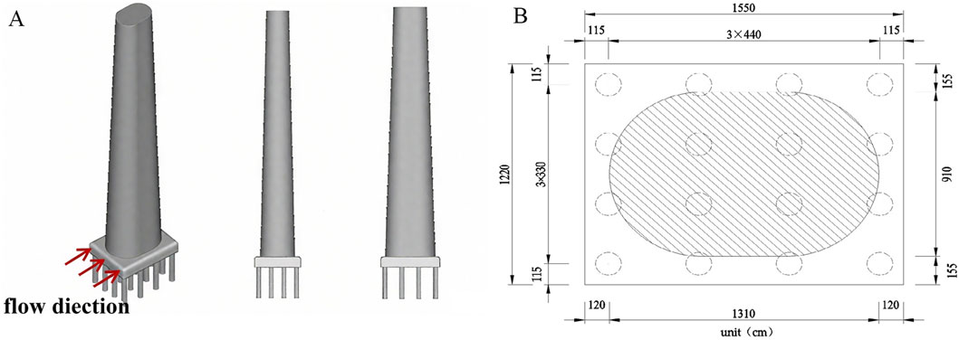 Figure 1. Schematic diagram of the complex pier: (A) 3D view of the complex pier, (B) Detailed dimensions.