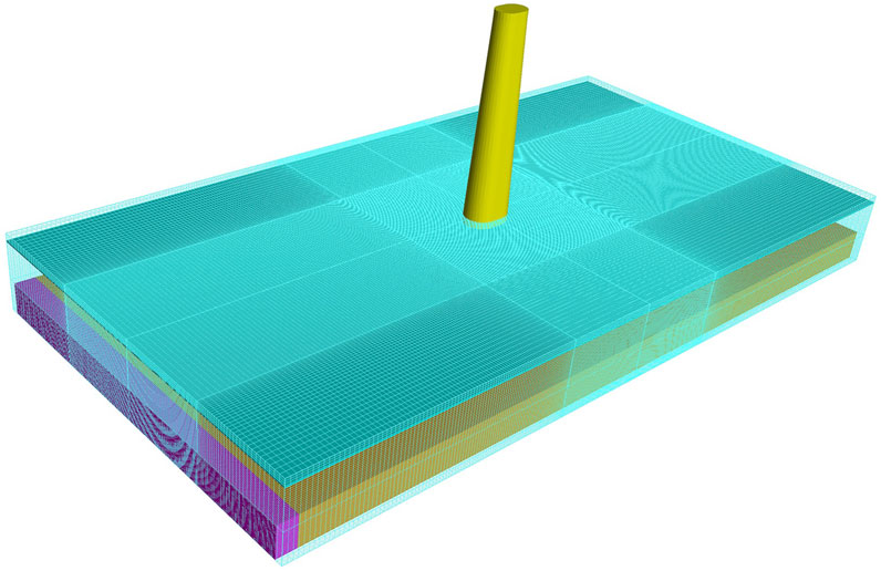 A 3D scour model is constructed using the software Flow-3D. The free surface between water and air is captured using the Volume of Fluid (VOF) method. Water and air in the model are assumed to be incompressible viscous fluids. Their movement is governed by the Reynolds-Averaged Navier-Stokes (RANS) equations, which are expressed as follows: