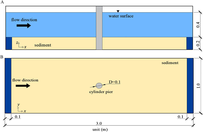 Based on the experimental setup of Roulund et al. (2005), a numerical model was constructed to simulate the scour process. The RNG k- turbulence model was employed to simulate flow dynamics. To balance computational efficiency with accuracy, the numerical flume was designed with dimensions of 3 m × 1 m × 0.7 m, as shown in Figure 3. The inlet and outlet were placed 1.5 m away from the cylindrical pier, while the lateral walls were positioned 0.5 m from the pier.