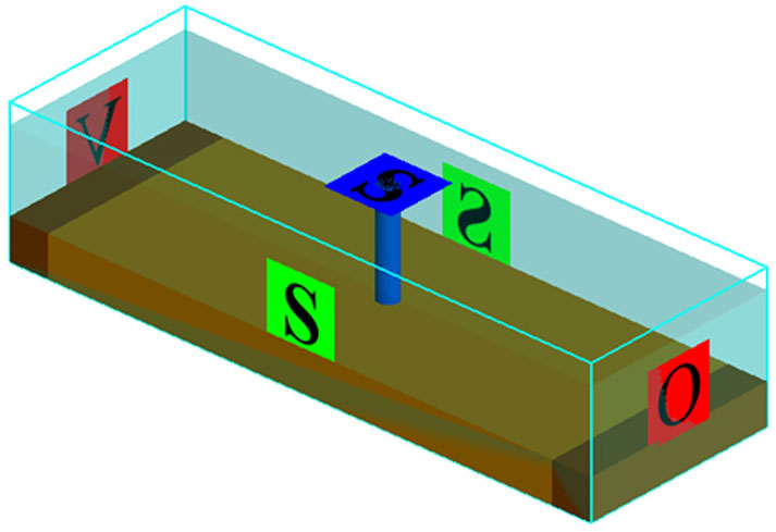 The left boundary of the flume is set as the inflow boundary, where the flow velocity and water depth are specified to simulate uniform flow. The right boundary is defined as an outflow boundary, with free outflow conditions. The bottom boundary is set as a no-slip wall, where the normal velocity of the fluid at the boundary is zero. The top and lateral boundaries are defined as symmetry boundaries, with zero flow flux and zero shear stress at these locations.