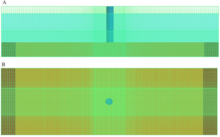 Figure 5. Schematic diagram of mesh configuration for the validation model: (A) Front view; (B) Top view.