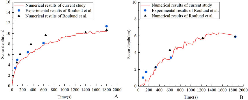 Figure 6 presents a comparison between the numerical simulation results and the experimental data from Roulund et al. (2005). As shown in the figure, the scour depth evolution from the numerical model is in excellent agreement with the experimental results. During the initial 200 s of scour, the scour depth in front of the pier in-creases rapidly, and then the scour rate gradually decreases, reaching equilibrium after 1800 s. In contrast, the scour depth behind the pier increases more slowly, and the maximum scour depth is significantly smaller than that in front of the pier. Once equilibrium is reached, the scour depth behind the pier is approximately 52% of the depth in front of the pier. The numerical model developed in this study accurately simulates the development of scour depth around the pier. At equilibrium, the error between the simulated scour depth and the experimental results is less than 10%.
