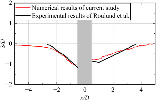 To validate the accuracy of the scour model developed in this study, the experimental results from Roulund et al. (2005) are used for comparative analysis. Roulund et al. (2005) conducted experiments to investigate the flow field characteristics and scour depth evolution around a cylindrical single pier under uniform flow conditions. Their experimental flume had a length of 9.9 m, a width of 3.6 m, a water depth of 0.4 m, and a flow velocity of 0.46 m/s. The cylindrical pier in their experiments had a diameter of 0.10 m and was placed 6.60 m downstream of the flume inlet.