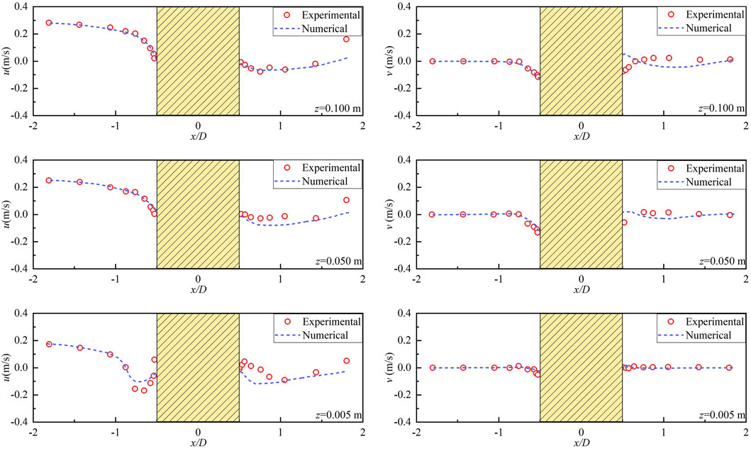 To further strengthen the validation of the numerical model, additional comparisons were performed between the simulated and experimental velocity fields from the study of Roulund et al. (2005). Velocities at three representative elevations above the bed (z = 0.10 m, 0.05 m, and 0.005 m) were extracted from both the numerical results and the experimental measurements for direct comparison. As shown in Figure 8, the horizontal velocity gradually decreases as the flow approaches the pier at higher elevations (z = 0.10 m and 0.05 m). Near the bed (z = 0.005 m), the horizontal velocity initially decreases to a minimum value and then slightly increases. The vertical velocity remains close to zero in the far field but becomes increasingly negative near the pier, reaching its maximum downward magnitude at the upstream face of the pier, indicative of the formation of the horseshoe vortex and the downward jet.